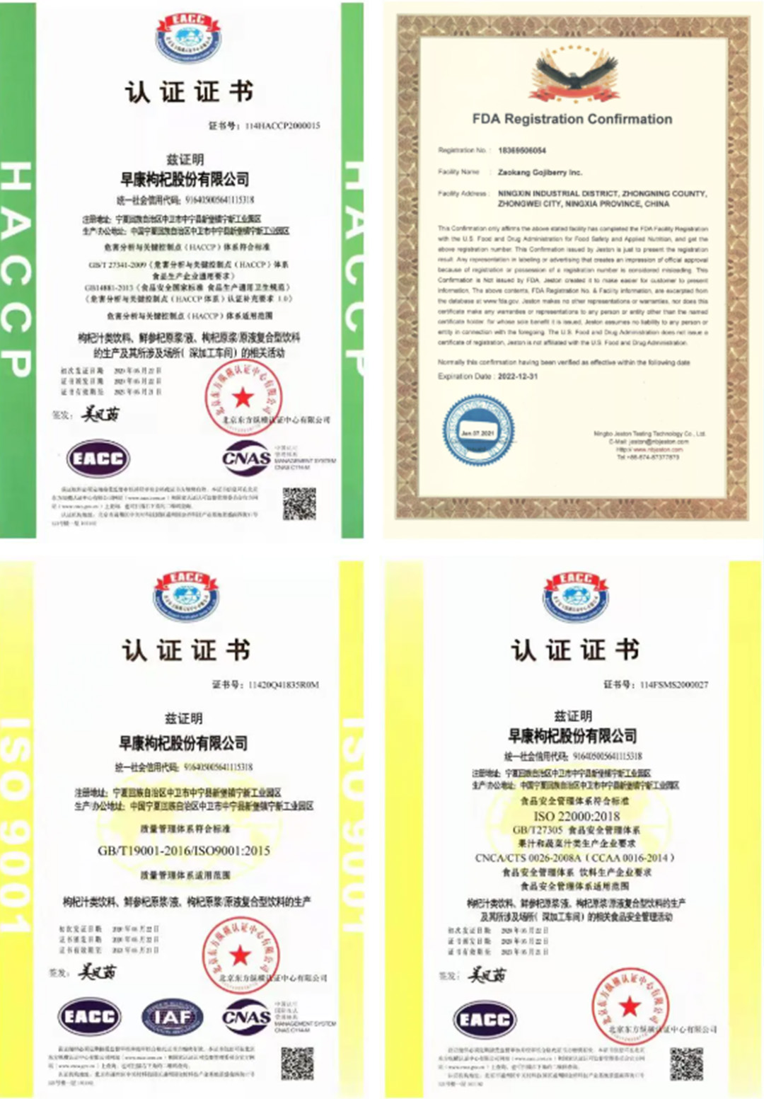 公司產(chǎn)品出口英、日、美、澳、歐盟等30多個國家和地區(qū),早康產(chǎn)品已獲得美國食品和藥物管理局認證,且公司已全面通過HACCP、ISO22000:2018食品安全管理體系,ISO9001:2015質(zhì)量管理體系認證,憑借先進的生產(chǎn)工藝和嚴格的質(zhì)量管控,2020年1月被自治區(qū)林業(yè)和草原局授予“寧夏枸杞行業(yè)知名品牌”稱號。