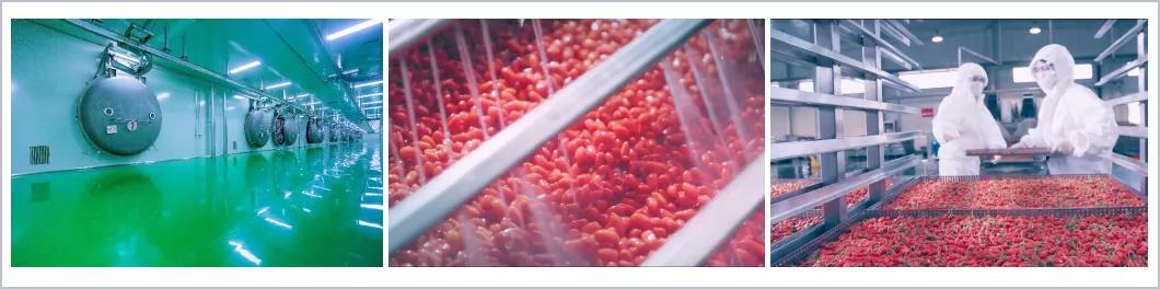 早康公司擁有2個生產(chǎn)工廠,其中老工廠占地52畝,主要生產(chǎn)加工枸杞干果和枸杞原漿系列產(chǎn)品。公司擁有年產(chǎn)6000噸枸杞干果生產(chǎn)線,5000噸枸杞原漿生產(chǎn)線,日產(chǎn)48萬瓶枸杞原液灌裝生產(chǎn)線,日產(chǎn)50萬袋枸杞原漿生產(chǎn)線。新工廠占地138.2畝,配套大型凍干設(shè)備12臺,年生產(chǎn)規(guī)模是1000噸凍干鎖鮮枸杞。2021年新建成的GMP藥品級無塵凈化枸杞原漿灌裝車間及凍干枸杞車間為國內(nèi)第一家。