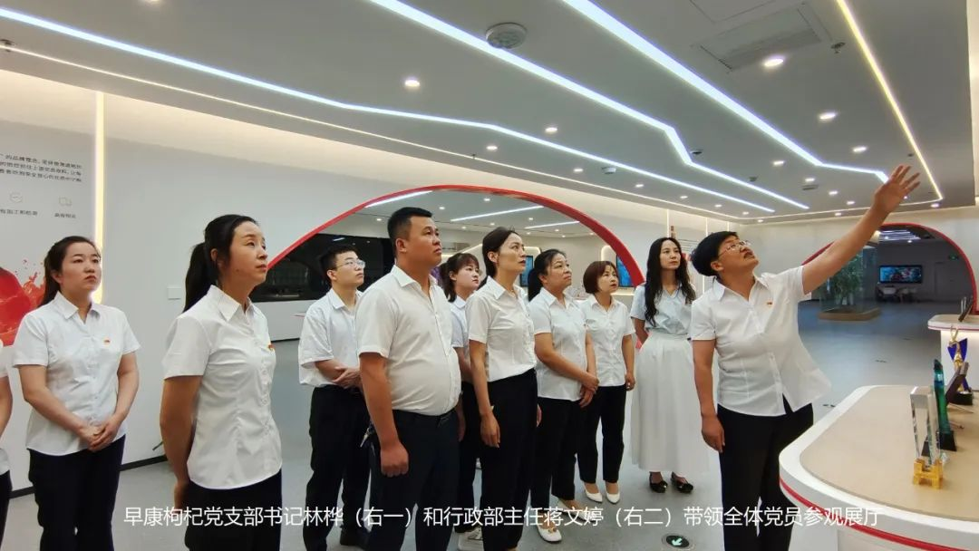 早康枸杞黨支部書記林樺和行政部主任蔣文婷帶領(lǐng)全體黨員參觀展廳
